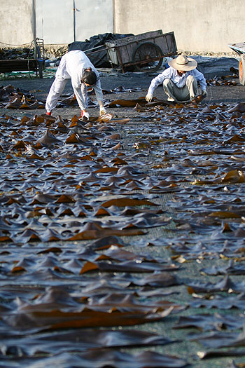 건져 올리고 씻어내고 헹구고 쌓고. 작업하는 속도가 급하다. 시간에 맞춰 밭에 말려 놓은 다시마를 걷어야 하고 또 지금 해낸 다시마를 시간에 맞춰 널어야 한다.