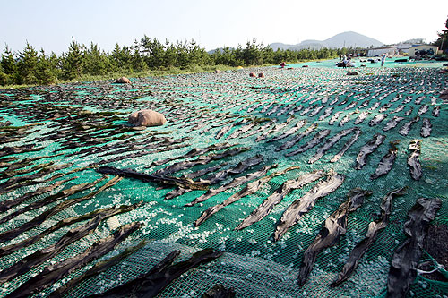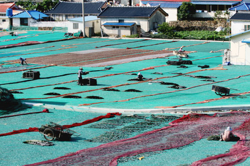섬 안에서도 다시마 양식을 가장 많이 하는 마을은 도장리와 척치리. 보리 콩 고구마를 키우던 밭에는 어김없이 노란, 파란, 빨간 망이 깔렸고 그 위에 검은 다시마를 널어놨다. 바람에 날릴세라, 망으로 한 차례 덮어놓았다.