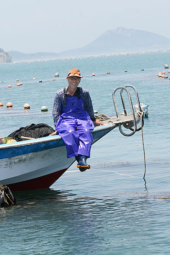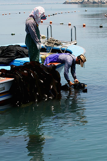 작업은 그리 복잡하지 않다. 줄 따라가며 다시마를 건져 올리고 물분사기를 이용해 씻어내고 다시 바닷물에 헹궈내 차근차근 정리하는 것. 그러나 허리 굽혀, 바다까지 손 내밀어 해야 하는, 반복된 작업, 결코 만만한 일이 아니다. 윤방금씨는 “다시마 하는 사람들 허리 안 상한 사람이 없어. (다시마를 걷어올리려면) 배 깔고 해야 하기 때문에 가슴이 멕히요” 하고 말한다.