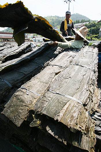 | ▲ 공판을 보기 위해 다시마를 쌓고 있다. 올해는 이른 장마로 수확량이 예전만 못하다. ⓒ 김창헌 기자 | ||