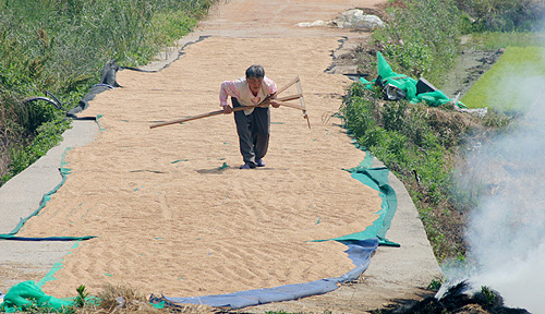 ▲ 햇보리 말리는 할머니. ⓒ 김도수