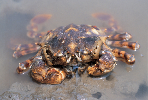 호랑이를 닮은 '범게' 부안시장 어물전에 가면 가끔 범게를 볼 수 있다. 어부들이 쳐놓은 그물에 걸려든 것이다. 게장을 담가 먹으면 맛있다며 권하지만 이 게가 얼마나 귀한 게인지는 사람들이 잘 모르는 것 같다. 범게는 지구상에서 유일하게 우리나라 서해에서만 산다. 그런데 해양환경의 변화와 남획으로 인해 개체수가 날로 줄고 있어 보호대책이 시급하다.