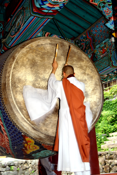 | ▲ 법고를 치고있는 스님의 모습을 보고있노라니 씻겨간 나쁜 마음들은 이어진 범종 소리를 타고 스르륵 사라져 버리고 그 맑은 종소리의 떨림이 가슴에 전해지면서 내 마음도 함께 맑아지는 느낌이었다.ⓒ전진호 기자 |
