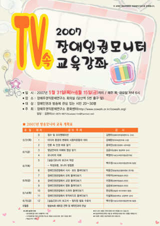 ‘2007 TV속 장애인권모니터 교육강좌’는 오는 31일부터 6월 15일까지 매주 목, 금 저녁 6시 장애우권익문제연구소 회의실에서 진행되며 수강료는 무료다.