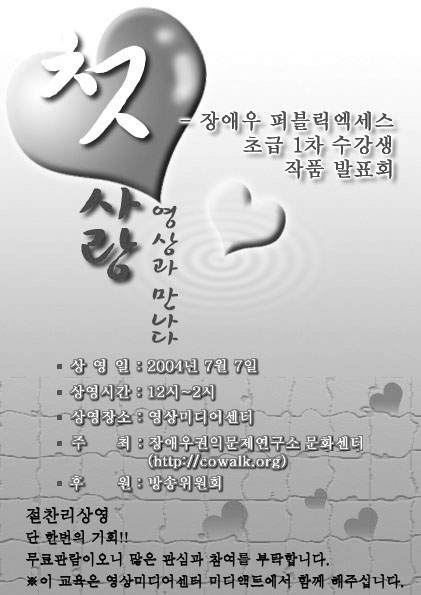 하하, 그런데 공교롭게도 이 날 시사회는 7월 7일, 칠월 칠석이었다. 견우와 직녀가 만나 눈물을 흘려, 온 세상에 비로 흩뿌려진 것이다. 비가 오면 휠체어를 이용하거나 몸이 불편한 사람들의 외출이 힘들어지는데, 시간도 더 걸릴 테고…. 하지만 그건 기우였고, 많은 관객들이 지켜보는 가운데 허성현(초급 1차 대표)씨의 사회로 시사회는 시작되었다.