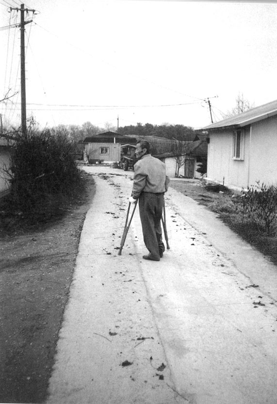 “논에 장마가 져서 물꼬를 틀라고 하는데 꽝하는 거예요.” 미군들이 매설했다가 제거하지 않고 철수하면서 유실된 지뢰에 의해 발목을 잃으신 김용관 할아버지는 언제 여쭤봐도 그게 사고의 전부였다. 독재시대 억눌림을 당하고, 지역적으로도 차별을 당해오면서 자신들의 이야기를 공감대로 형성해 본적이 없는 분들이었기에 이들에게는 일단 스스로에게 말하기가 필요했다. “처음엔 파인더를 통해 상대를 제대로 보지도 않고 막 눌러대는 것이 다반사”였다고 이시우씨는 말한다. 매달 약속을 잡고 찾아갈 때마다 대인지뢰특별법이 어떻게 진행되고 있는지 무엇이 필요한지를 설명하고 듣고를 반복하며 상대방을 제대로 보고 사진을 찍는 것이 법의 통과를 위해서도 중요한 일임을 설명해드렸다. 그리고 여름에서 가을로 계절이 지나가면서 사진은 점점 제대로 찍혀져 갔다. “서로가 노력하지 않으면 눈빛이 마주치는 사진은 불가능하다. 진정한 교감의 시작, 인간적 교류의 시작은 눈빛의 교감으로부터 시작된다. 피해자분들이 바로 선 사진을 찍기 시작했다는 것은 상대를 통해 자신을 보기 시작했음을 의미한다”며 이시우씨는 “지금까지는 나만의 아픔이고 한이었지만 이제는 함께 할 사람을 만난 것”이라고 설명한다.