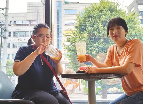 소화도 시킬 겸 산책을 하며 짝꿍이 애용하는 다이소로 갔다. 그림그리기를 좋아한다며 종이를 사기 위함이었는데 들어서자마자 “입술 발라야 해”하고는 곧장 화장품 판매대에 섰다. 비치돼 있는 거울도 보지 않고 새빨간 립스틱을 마구 바르는 걸 보니 어리둥절했다. 예쁜 걸 좋아하는 마음은 같은 거구나 생각도 들고 천진난만하게 느껴졌다. 그날 하루 짝꿍에게서 제일 많이 들었던 말은 ‘좋아요’였는데, 사전 만남 때 들었던 걱정과 달리 친근하고 적극적으로 임해서 한결 안심되었다. 하지만 습한 날씨 때문이었는지 열의보다 체력이 금방 지치는 걸 보고 걱정되고 난감하기도 했다. 갑자기 너무 힘들어해서 가까운 은행에 들어가 쉬었는데 그사이 아버지께 전화 걸어 “힘들다고 빨리 데리러 오라”고도 했다. 다음 만남에는 짝꿍의 열정대로 다 맞춰주기보다 조금 느긋하게 해야겠다 다짐도 했다.