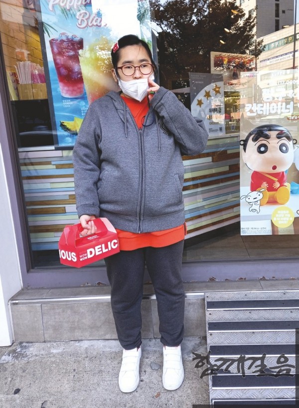 우리의 세 번째 만남은 10월 19일이었다. 짝꿍 집 앞에서 어머니와 함께 나와 만났는데 나를 보자마자 “오랜만이에요!”라며 말하고 곧장 내 손도 먼저 잡았다. 9월에 만나고 그렇게 오래간만인가 싶었는데 짝꿍 입에서 나온 그 말이 퍽 신선하게 다가왔다. “○○ 씨 사진 찍어줄게요.” 하면 바로 눈을 맞추고 브이하며 포즈를 취했다. 다른 장소로 이동하는 길에 있던 가게에 짱구 포스터가 붙어 있는 걸 보고는 멈추더니 자기가 좋아한다며 브이하며 적극적으로 촬영 요청도 했다. 그날 들른 상점들에서 내가 내어준 카드로 결제도 잘하고 시크한 목소리로 “영수증 주세요.” 하는 것도 보니 괜히 흐뭇했다. 계속 결제하고 싶어 해서 그날 갔던 상점만 모두 네 곳이다. 계산하는 것에 부쩍 자신감이 붙고 재미를 느끼는 것 같았다. 걷다 보니 가로수에 가을이 찾아오고 있었다. 막 물들기 시작한 예쁜 잎과 짝꿍을 찍어주고 싶어 나무 앞에 서보라고 했더니 브이하며 바로 호응해줬다.