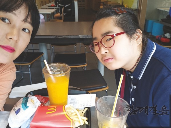 어머니와 조율한 날짜에 맞춰 나갔던 6월 22일 첫 만남의 날. 본격적인 여름이 목전에 있어 햇볕이 뜨겁고 습도가 높았지만, 짝꿍의 기분은 맑아 보였다. 좋아하는 햄버거를 먹으러 짝꿍 집 근처 맥도날드로 갔다. 에어컨 바람에 열을 식히며 키오스크에서 짝꿍에게 주도권을 주고 각자 먹을 햄버거 세트를 주문했다. 어머니와는 간단히 인사 나누고 헤어지고 둘만의 시간이 시작되었다. 허겁지겁 햄버거를 먹는 짝꿍을 바라보다가 인증사진을 찍자고 요청했다. 렌즈에 눈을 잘 맞추도록 안내하고 짝꿍이 잘 나올 때까지 연속으로 사진을 찍었다. 여러 차례 만에 성공해서 이번에는 각자 먹고 있던 음료로 짠! 하며 찍어 보자고 설명했다. 대답은 자신 있게 알겠다고 했지만, 건배는 0.01초 정도로 하는 둥 하고 바로 마셔, 나만 컵을 내민 장면이 찍히게 되어 웃음이 나왔다. 배가 차 보이지는 않았는데 감자튀김을 조금 남기길래 물어보니 아빠에게 갖다 드린다 했다. 효심이랄까, 그 행동을 보자니 묘한 감정이 들었다.