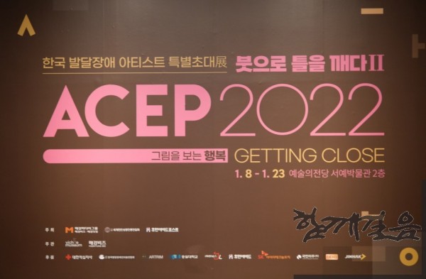 서초동 예술의전당 서예박물관에서 개최된 'ACEP(Art and Cultural Exchange Program) 2022 붓으로 틀을 깨다Ⅱ…한국 발달장애 아티스트 특별초대展'이 성황리에 막을 내렸다. 지난 2020년 9월 예술의전당 한가람미술관에서 개최한 ‘ACEP 2020 한-EU 발달장애 아티스트 특별전’에 이은 두 번째 전시다. 이번 전시는 1월8일부터 23일까지 예술의 전당 서예박물관 2층에서 'Getting Close'라는 부재를 달고 한국 발달장애 아티스트 43명의 작품 100여 점을 선보였다.