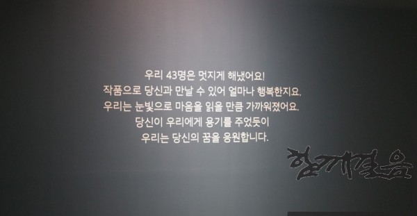 전시장 입구 한 쪽에 마련된 대형 사진이 관람객의 이목을 끌었다. 함께걸음 1,2월호를 받아 본 독자라면 익숙한 사진일 것이다. 바로 이번 특별전의 주역인 43명의 발달장애 아티스트가 한데 모인 사진이다. 그들은 자신의 이름을 걸고 자신의 작품으로 세상 앞에 섰다. 그리고 그들의 이번 전시가 특별한 배경에는 한 가지 이유가 더 있다. 바로 최초의 '유료'전시라는 점이다. 이는 발달장애 아티스트의 상업 전시의 시작을 알렸다는 점에서 중요한 의미를 지닌다. 또한, 예술이 더 이상 발달장애인에게 단순한 취미가 아닌 또 다른 경제활동 영역이 될 수 있다는 것을 보여준다는 점에서 시사점을 가진다.