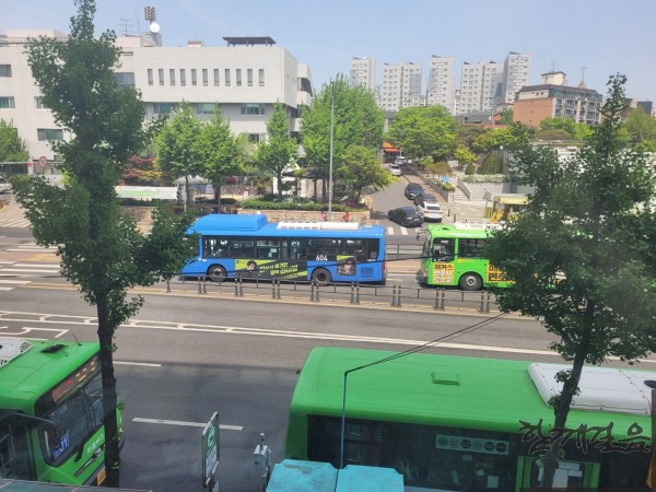 취재원을 만나 인터뷰를 하기 위해 약속된 카페에 먼저 가서 기다리던 중, 무심코 창밖을 내다보니 버스 두 대가 보입니다. 파란색과 초록색 버스가 서 있습니다.