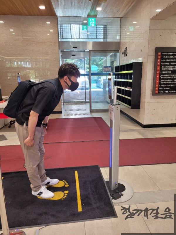 체온 측정을 하는 경우도 있는데, 이룸센터 같은 경우는 얼굴을 기계에 가까이 대면 체온 측정이 돼요. 저는 여기에 얼굴을 가까이 대면 체온이 측정되었는지 여부를 제대로 확인을 못하겠어요. 이것도 “정상체온입니다”라고 소리가 들린다는데 그걸 못 듣고, 측정된 체온이 숫자로 나온다는데 너무 작은 크기라서 어디에 나오는지 한번도 제대로 본 적이 없습니다.