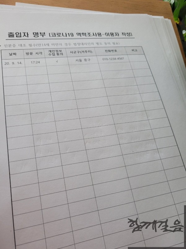 QR코드나 체온 측정을 하는 기계가 없는 곳은 종이로 된 방문자 명부를 작성해야 합니다. 그런데 이 방문자 명부도 장소마다 조금씩 양식이 다르더라고요. 제 경험으로는 방문날짜, 방문시각, 이름, 연락처, 주소를 적는 게 대부분이었는데, 최근에는 개인정보수집에 대한 동의라는 칸에 체크를 해야 한다는 게 있다는 것도 알게 되었어요.