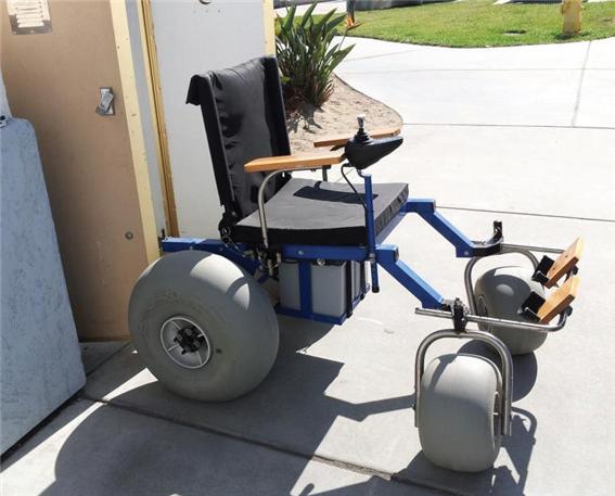 또 다른 휴가철 레저용 보조기구로 해변용 전동휠체어도 있다. 역시 일반적인 전동휠체어와 같은 기능을 하는 제품인데, 바퀴만 다르게 생겼다. 해변용 전동휠체어는 일반 타이어와는 다르게 두껍고, 통통한 풍선처럼 생긴 큰 타이어가 달려 있다. 모터의 힘으로 굴러가는 구동축의 바퀴가 거의 지름이 50cm에 달할 정도로 크다. 두껍고 큰 바퀴를 가지고 있어서 모래사장에서 바퀴가 빠지거나 헛돌지 않고 자유롭게 다닐 수 있다. 하지만 전기장치를 사용하는 전동휠체어이기 때문에 모래사장을 누비고 다니는 것까지는 괜찮지만, 물속에 들어가서는 안 된다는 한계가 있다.