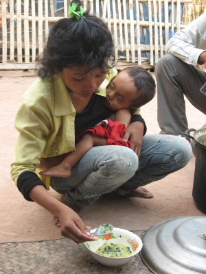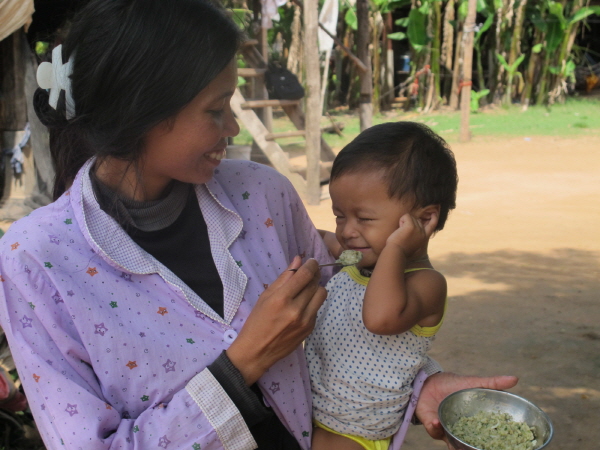 | ▲ 캄보디아에 사는 떠우르트 동 아줌마가 아이에게 영양죽을 만들어 먹이고 있다. ©사진/월드비전 제공 | ||