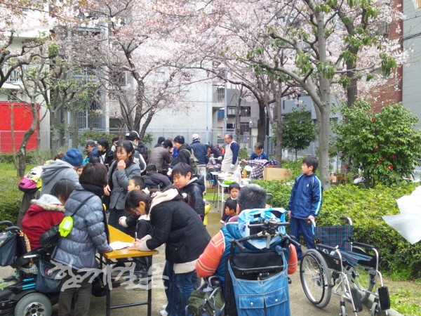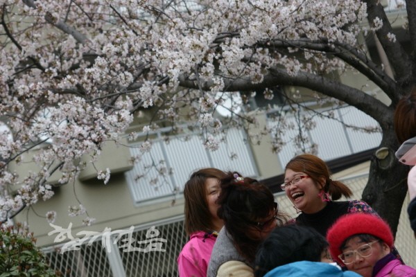 최근에 제가 자주 참석하는 벚꽃놀이는 ‘파티파티’라는 장애인단체에서 여는 자리로, 벌써 십수 년 동안 매해 열리고 있는데, 기획부터 선전, 준비, 접수, 진행을 장애인 스텝과 비장애인 스텝들이 함께 하는 이벤트입니다. 물론 육체적인 일은 비장애인 스텝이 주로 하지요. 시장을 보고, 불판을 차리고, 고기를 굽고…. 이 벚꽃놀이에서 자랑하는 메뉴로는 불고기, 야키소바(일본식 볶음우동), 주먹밥, 스텝으로 일하는 재일동포 2세 분이 직접 담근 김치, 깍두기, 나물, 스텝이 만든 쿠키와 케이크 등입니다. 소박하지만 정성껏 차린 음식들을 뷔페식으로 얼마든지 먹고 마시며 꽃놀이를 즐기지요. 회비는 술 마시는 사람이 2천 엔, 술 안 마시는 사람이 1천 엔, 아이는 무료. 누구라도 환영입니다. 단체 사무실 바로 뒤편 공원에서 열린 이번 벚꽃놀이도 만원사례, 음식도 남은 게 없었다고 하네요.