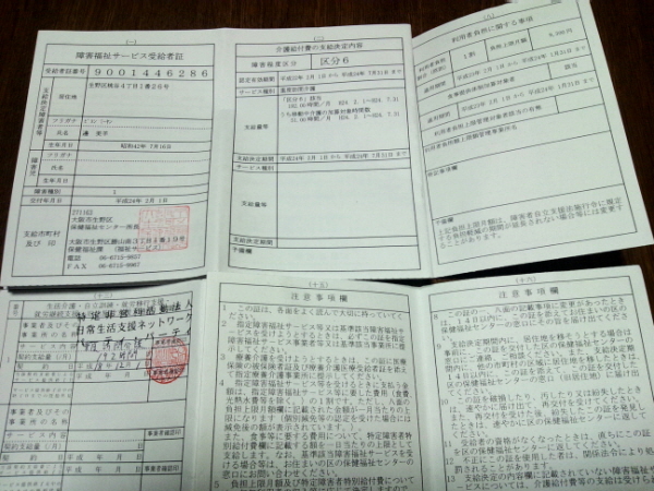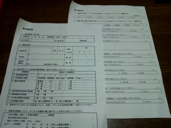 일단 구청에 신청하면 구청에서는 장애 정도를 판단하기 위해 조사원을 파견하고, 조사원은 장애인과 직접 만나 106항목을 조사, 취합해 전문의나 사회복지사 등으로 구성된 인정심사위원회에 올리게 됩니다. 그것으로 장애정도구분이 판정되면 그 시간과 서비스에 맞춰 위탁받은 장애인상담센터나 사회복지협의회 등에서 장애인 당사자와 협의해 서비스이용계획이라는 것을 작성합니다.