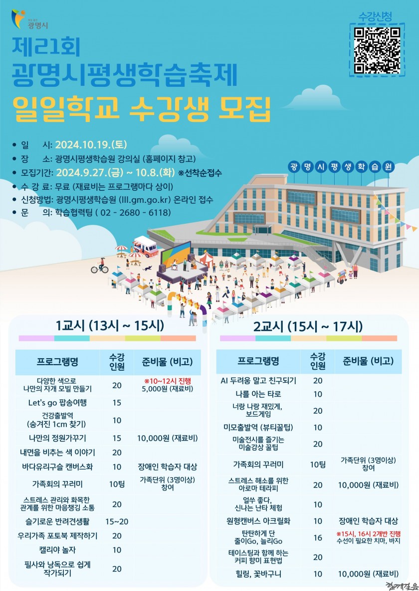 평생학습 일일학교 수강생은 오는 10월 8일까지 선착순 모집된다. 평생학습 일일학교는 광명시 평생학습 통합플랫폼 ‘광명e지’를 통해 신청 가능하다.