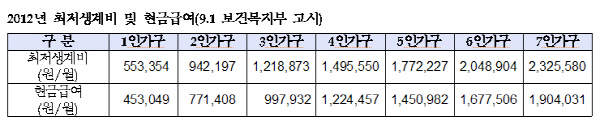 지난 9월1일 최종고시 된 2012년 최저생계비는 2011년에 비해 3.9% 인상된 것이다. 이번 결정은 계측연도가 아닌 해에는 물가상승률을 자동 반영하기로 한 중생보위의 결정을 따른 것이지만, 최근 이어지고 있는 살인적인 물가상승률에도 못 미치는 인상 폭을 보였다. 최저생계비는 기초생활수급자의 급여 수준을 결정하는 동시에, 한국사회의 빈곤을 가늠하는 지표다.