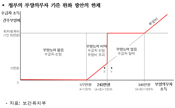 위 표를 살펴보면, 부양의무자 소득기준을 최저생계비의 130%에서 185%로 완화하는 정부 방안의 한계를 알 수 있다. 부양능력 없음 기준을 상향하지 않고, 부양능력 있음 기준을 상향함으로써, 결국 간주부양비가 부과되는 구간이 넓어지는 것이다.
