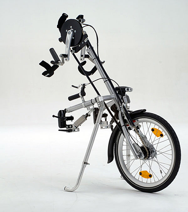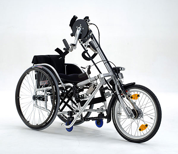 휠체어가 손 자전거로 변신하게 해 주는 제품도 있다. 일반적으로 사용하는 휠체어의 앞쪽에 손으로 돌리는 페달과 핸들이 달린 앞바퀴 하나가 제품 전부이다. 앞쪽에 연결하는 자전거 부분은 커다란 앞바퀴 하나와 핸들, 페달, 브레이크만 달려 있고, 뒷바퀴나 의자가 아예 없다. 대신 브라켓이라고 해서 바퀴 하나짜리 자전거 앞부분을 휠체어와 연결할 수 있는 틀이 달려서 휠체어 아래쪽 프레임에 단단하게 고정을 해서 연결을 하게 되어 있다.
