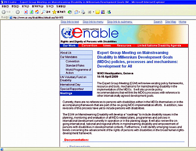 | ▲ 유엔새천년개발목표에 장애인 이슈를 주류화하기 위한 전문가 미팅이 2009년 4월 14일부터 16일까지 세계보건기구 본부(스위스 제네바)에서 열렸다. | ||