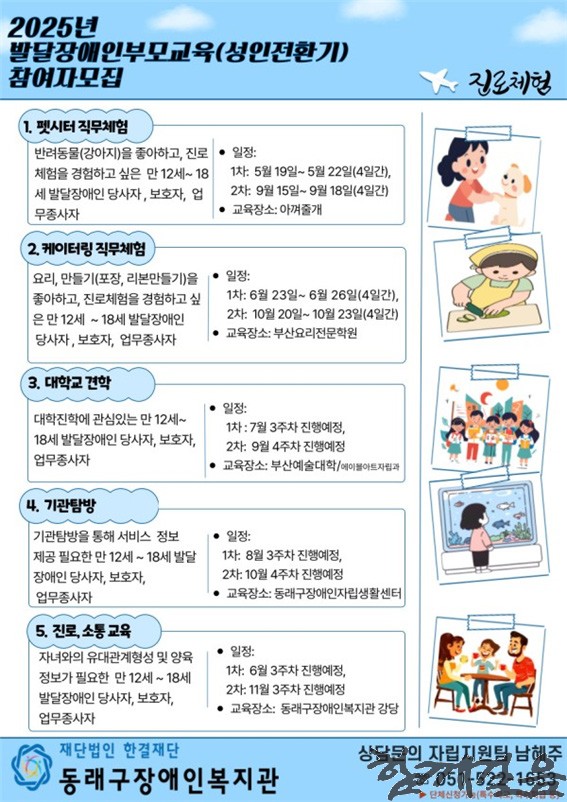 부산 동래구장애인복지관이 발달지원센터의 지원을 받아 ‘2025년 발달장애인부모교육 지원사업(성인전환기)’ 프로그램인 「진!로!이(怡)수(秀)다(多)」를 본격적으로 추진한다. 이번 사업은 성인 전환기를 맞은 발달장애인 당사자와 가족, 관련 종사자에게 실질적 진로 탐색과 소통 역량 강화를 돕기 위한 교육을 제공하는 것이 목적이다.