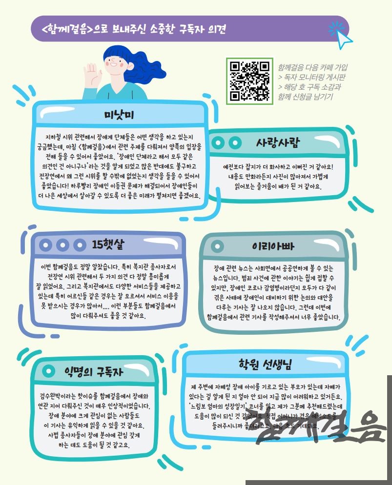 A. 각별히 아끼는 지인이 장애인 분야에 관심이 많아서 최근 지하철 시위 등 장애에 대한 여러 이슈에 관해 이야기를 전해 들을 수 있었습니다. 이야기를 듣고 나니 저도 관심이 생겨 <함 께걸음>을 읽어보게 되었고, 독자 모니터링에도 참여하게 되었습니다.