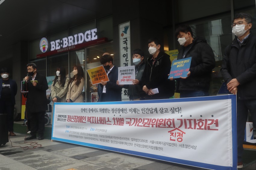 먼저 장애인 인권의 국제 조약인 UN장애인권리협약 19조를 보면 정신장애인을 포함, 모든 장애인이 지역사회에서 자립적으로 살아갈 수 있도록 국가로부터 지원받을 권리와 그에 필요한 활동지원서비스를 받을 권리를 명시하고 있다. 그럼에도 불구하고 국내의 정신장애인들은 아직도 사회적 편견과 낙인, 차별의 고통을 받으며 비인간적인 강제입원과 강제치료 속에서 신음하고 있다., 더욱이 장애인 복지가 발전하고 복지예산이 늘어나고 있는 가운데 장애인복지법 제15조에 의하여 법 적용대상에서 배제되고 있는 정신장애인들은 장애인복지법이 보장하고 있는 복지서비스로부터도 소외되고 있는 상황이다. 특히 장애인복지관 및 정신재활시설서비스 이용 제한, 각종 고용지원제도, 생애주기 별 맞춤서비스, 활동지원서비스 이용제한 및 공동생활가정 거주 등 지역사회에서 자립적으로 살아가기 위한 기본적인 복지서비스들을 다른 유형의 장애를 가진 사람들과는 달리 합리적인 이유도 없이 정신장애인이라는 이유만으로 제공받지 못하고 있는 실정이다. 이러한 배경하에 정신장애인의 인권적 복지서비스 차별에 대한 기자회견이 국가인권위원회 앞에서 이루어진 것이다.