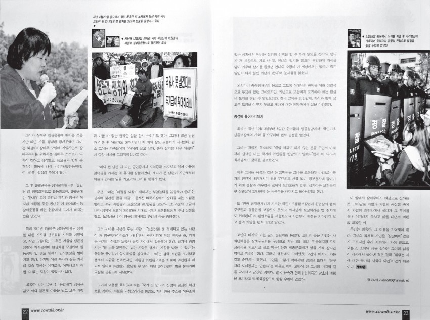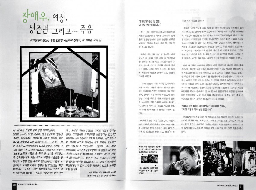 월간 <함께걸음>은 오래 전 장애인권운동의 생생한 기록들을 찾아, 지금 현재의 관점으로 그 의미를 되새기는 ‘<함께걸음> 다시 보기’ 연재를 새롭게 시작합니다. 디지털 아닌 필름카메라 시절의 사진들을 지면 촬영으로나마 복구하고, 색 바랜 기록으로만 남아 있던 장애인권운동사(史)의 연결고리를 하나씩 맞춰가는 의미 있는 시도가 되리라 기대합니다. ‘<함께걸음> 다시 보기’는 <함께걸음> 32년 역사의 PDF 전환작업을 위한 사전준비과정으로, 장애인권의 암흑기였던 20세기까지 되돌아보는 뜻깊은 발자취를 한 걸음씩 남겨놓겠습니다. 연재의 첫 순서는 대한민국 장애인권운동의 상징인 인물, 故 최옥란 열사의 마지막 절규와 몸부림을 취재했던 2002년 5월호 20~23면의 내용입니다.