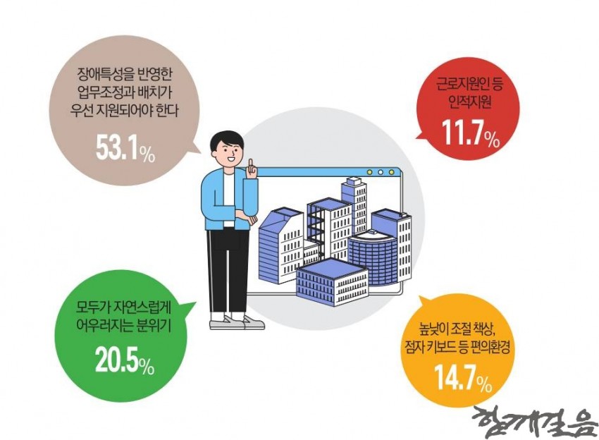 2025년 4월 14일부터 5월 7일까지 투표를 진행한 결과, 4가지 중 ‘장애특성을 반영한 업무조정과 배치가 우선 지원되어야 한다’고 답한 결과가 53.1%로 과반수 이상을 차지했다. 그 다음으로는 ‘모두가 자연스럽게 어우러지는 분위기’가 20.5%, ‘높낮이 조절 책상, 점자 키보드 등 편의환경’이 14.7%, ‘근로지원인 등 인적지원’이 11.7% 순으로 집계되었다.