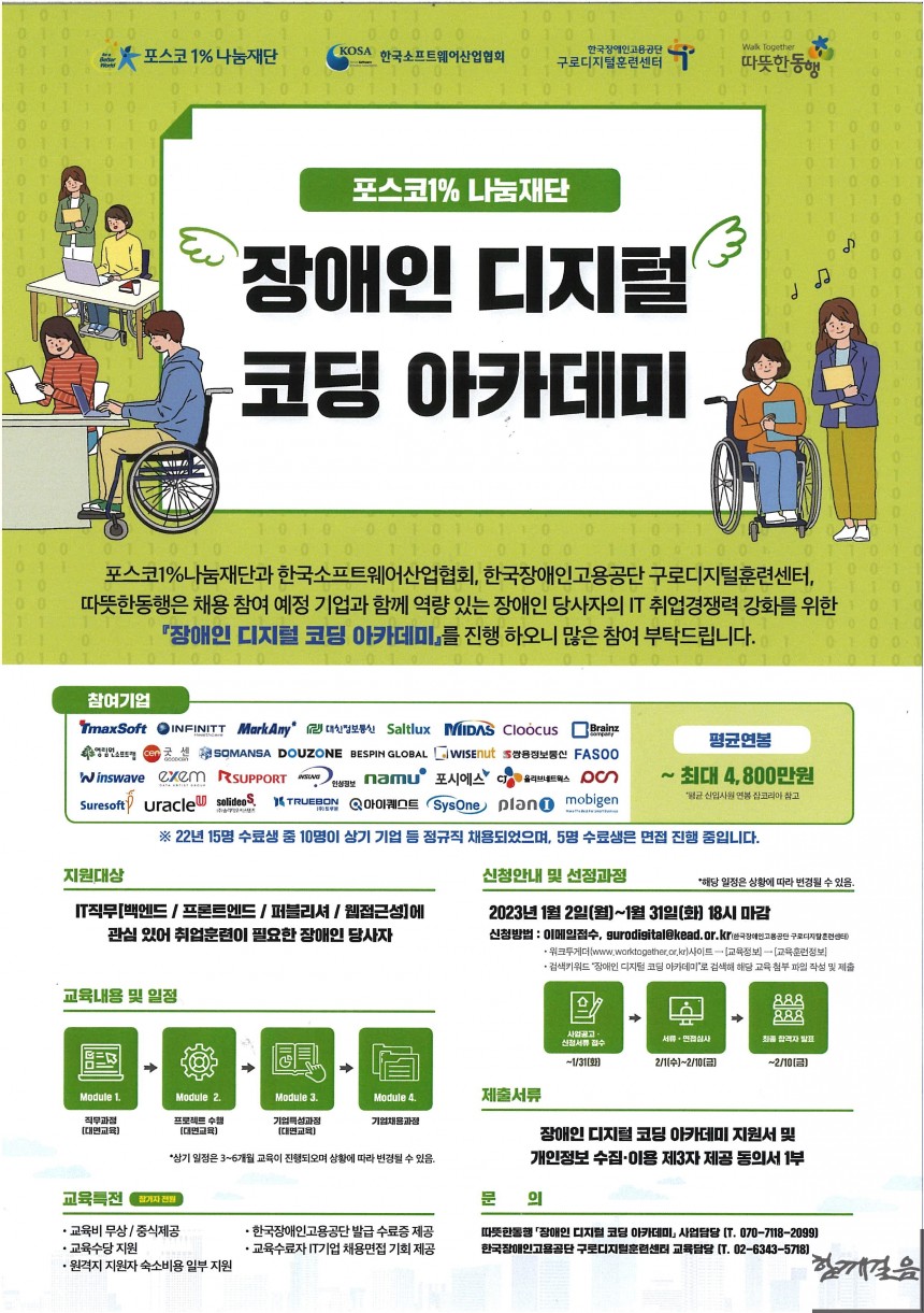 역량 있는 장애인 당사자의 IT 취업경쟁력 강화를 위해 포스코1%나눔재단과 한국소프트웨어산업협회, 한국장애인고용공단 구로디지털훈련센터, 따뜻한동행이 손잡고 「장애인 디지털 코딩 아카데미」 수강생을 모집한다.