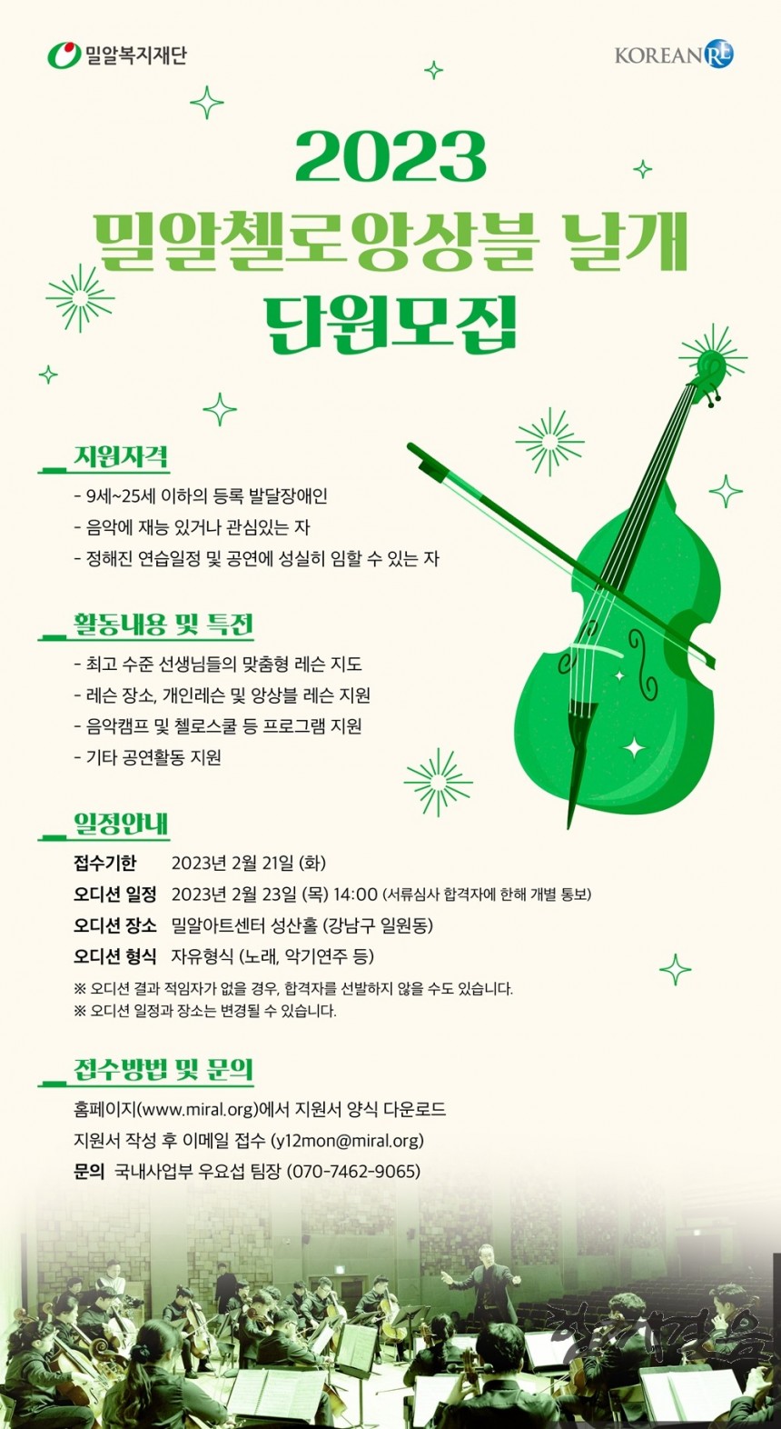 밀알복지재단(이사장 홍정길)이 밀알첼로앙상블 '날개' 단원으로 활동할 발달장애인 첼리스트를 모집한다.