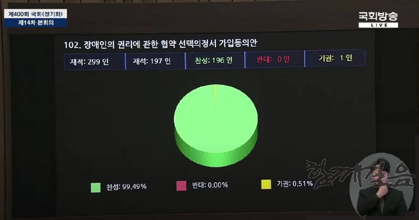 ▲ 제400회 국회(정기회) 제14차 본회의에서 '장애인의 권리에 관한 협약 선택의정서 가입동의안'이 통과되었다. 총 197명의 재석 인원 중 기권 1명을 제외한 196명이 모두 찬성하였다. 사진 국회방송 생중계 화면 갈무리.