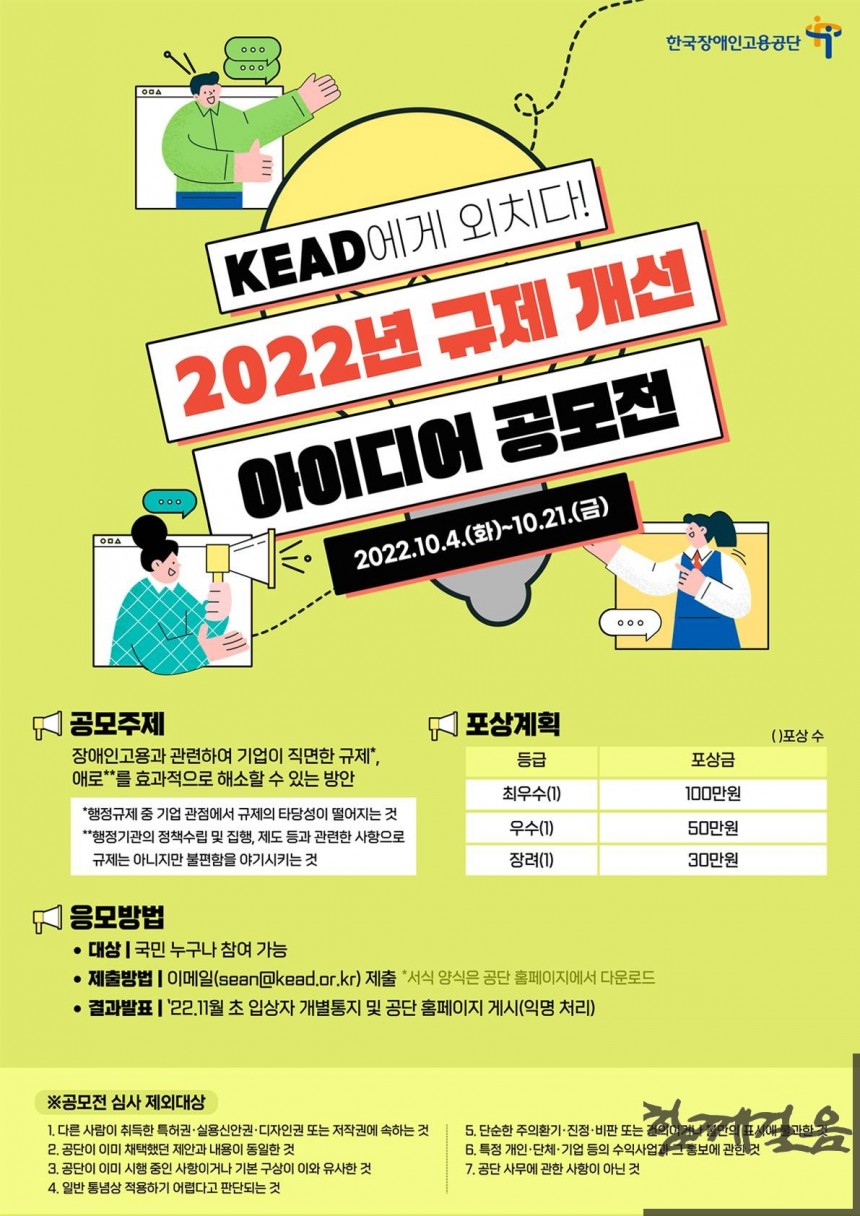 한국장애인고용공단(이사장 조향현)은 10월 4일부터 21일까지 대국민 규제개선 아이디어 공모전을 개최한다.