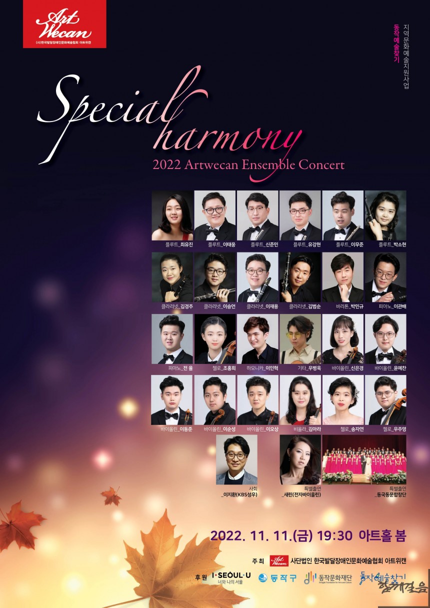 (사)한국발달장애인문화예술협회 아트위캔(대표:왕소영)은 11월 11일 금요일 저녁 7시 30분 동작구에 위치한 아트홀 봄에서 정기연주회 <Special Harmony>를 개최한다.