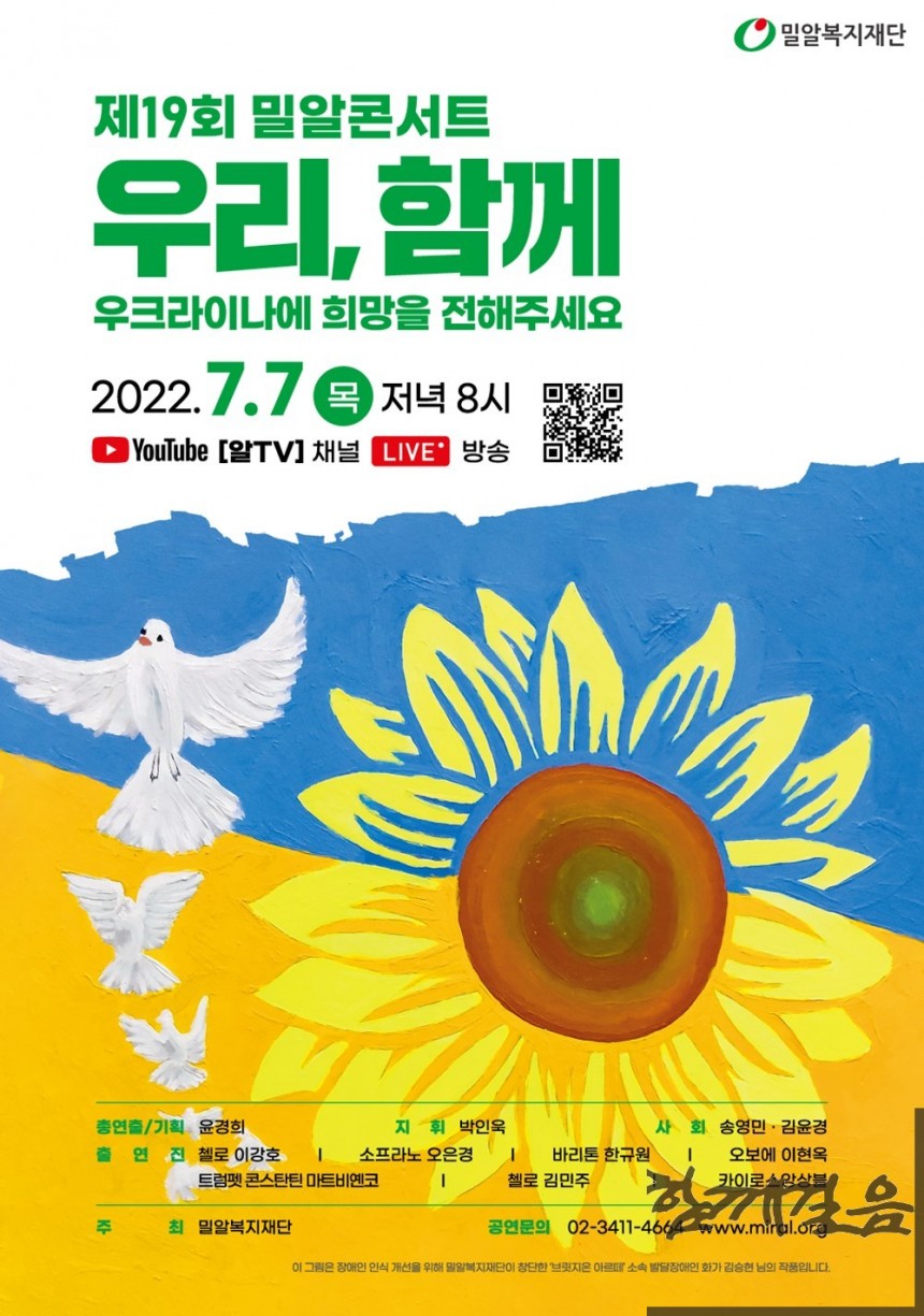 밀알복지재단은 삶의 터전을 잃은 우크라이나 난민들을 돕고자 7월 7일 저녁 8시 유튜브 ‘알TV’ 채널을 통해 ‘제19회 밀알콘서트를 개최한다.