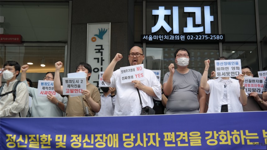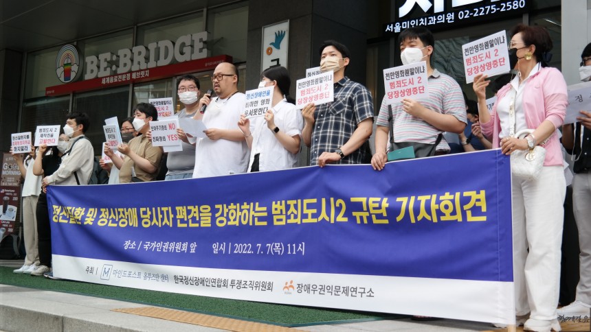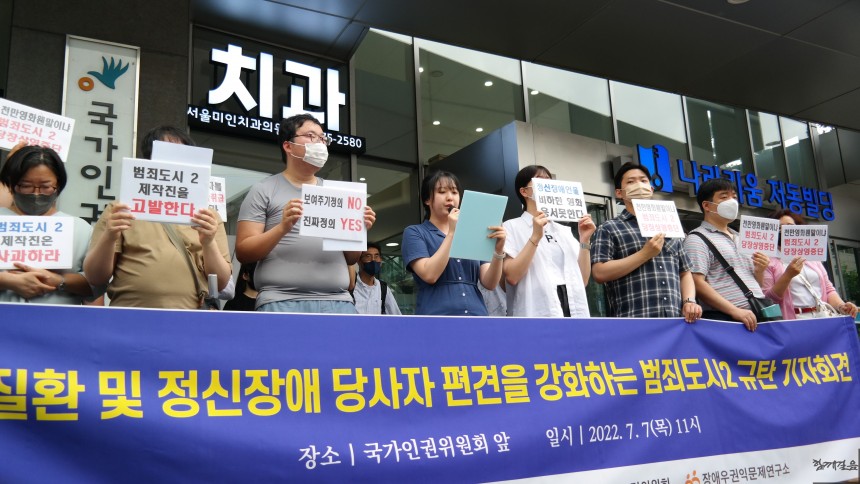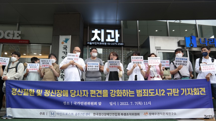 장애우권익문제연구소(이하 연구소) 등 단체들은 오늘(7일) 오전 11시 국가인권위원회 앞에서 영화 <범죄도시 2> 제작사에 정신질환 및 정신장애 당사자에 대한 편견을 강화하는 특정 장면의 삭제 및 정신장애 당사자에 대한 사과를 요구하는 기자회견을 열었다.
