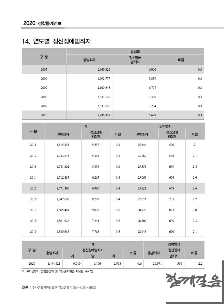 경찰청이 발간한 2020 경찰통계 연보에 따르면, 전체 범죄자 149만 4,421명 중 정신장애인은 9,019명으로 전체 대비 0.6%를 차지한다. 살인, 강도, 절도, 폭력 등 강력범죄의 경우 전체의 2.2%를 차지하며 매년 2%대를 유지하는 수준이다.
