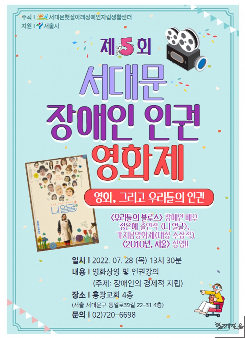 서대문햇살아래장애인자립센터(센터장 오문영)가 주최하고, 서대문구청이 지원하는 「제5회 서대문구 장애인 인권영화제」가 오는 7월 28일(목) 13시 30분 서대문구 홍광교회 4층에서 개막될 예정이다.