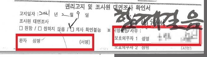 A 씨의 대리를 맡은 변호인 측은 2021년 2월 24일 작성된 행정입원에 대한 권리고지서가 작성되지 않은 점을 지적하고 이전에 작성된 권리고지서조차 환자의 성명이 전혀 기재되지 않고 보호의무자의 서명과 서명이 없거나 정신건강복지법상 보호자가 될 수 없는 경찰관의 성명만 기재된 점을 문제 삼았다.