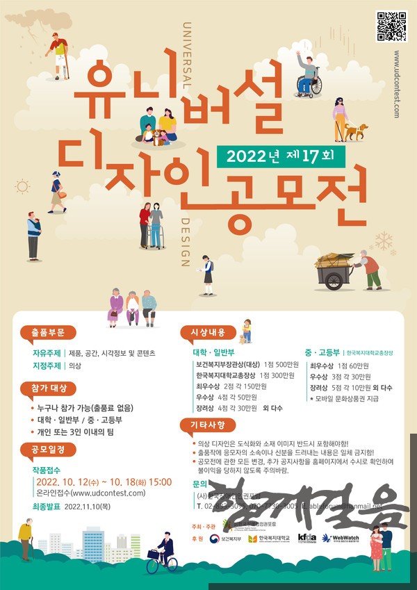 (사)한국장애인인권포럼이 주관하고 보건복지부·한국복지대학교·한국디자인단체총연합회·사회적기업 웹와치가 후원하는 유니버설디자인 공모전이 오는 9월 27일(화)부터 출품작을 모집한다.