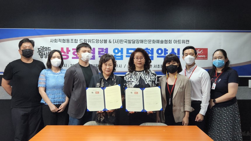 사단법인 한국발달장애인문화예술협회 아트위캔(대표: 왕소영, 아래 아트위캔)은 8월 31일(수) 사회적협동조합 드림위드앙상블(이사장: 이옥주)과 상호 업무협약(MOU)을 체결했다. 이날 협약식에는 아트위캔 왕소영 대표, 이옥주 드림위드앙상블 이사장 등 두 단체의 관계자들이 참석했다.