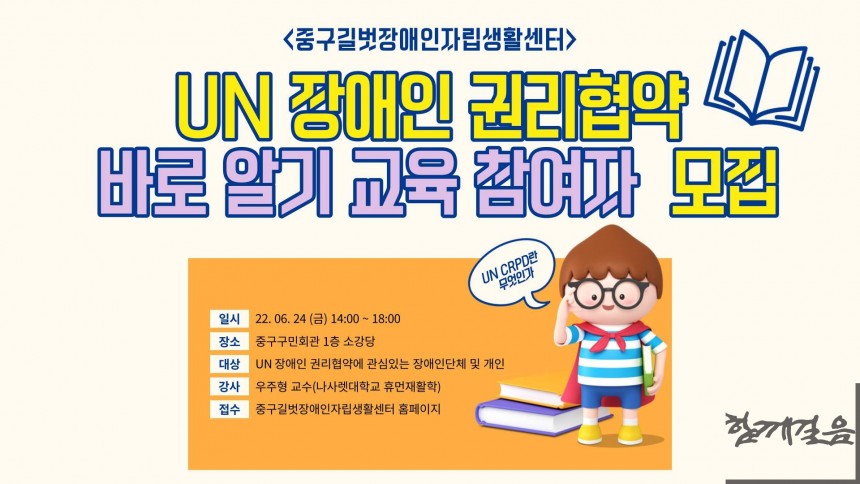 중구길벗장애인자립생활센터(이하 센터)에서 ‘UN 장애인 권리협약 바로 알기’ 교육 참여자를 모집한다.