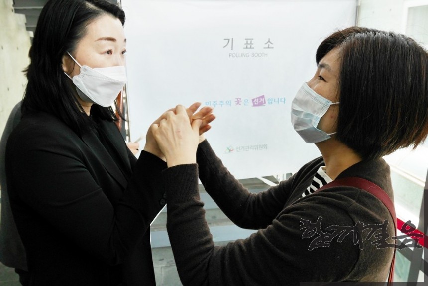 ↑지난 2020년 21대 국회의원 선거 당시, 통역사(좌)로부터 촉수화로 투표 방법에 대해 설명을 듣는 시청각장애인(우)