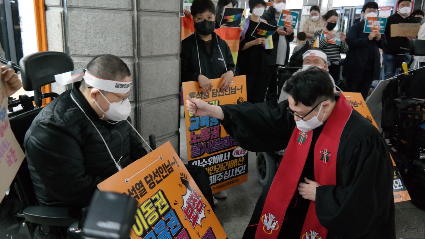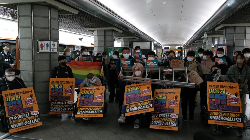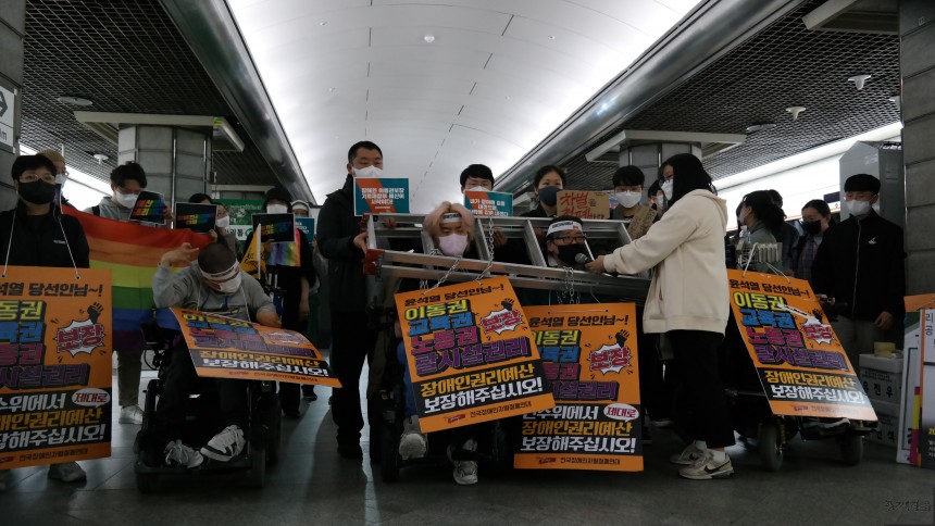 12일 오전 8시 경복궁역, 휠체어를 탄 2명의 장애인의 몸에 사다리가 걸쳐지고 쇠사슬이 감겼다. 분홍색으로 물들인 머리카락이 지하철 역사에 울려 퍼지는 구슬픈 노래에 맞춰 어깨 위로 한 줌씩 떨어졌다.
