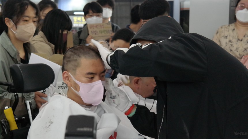 전국장애인차별철폐연대(이하 전장연)는 매일 오전 8시 서울지하철 3호선 경복궁역에서 릴레이 삭발투쟁을 10일째 이어오고 있다. 이번 삭발식에는 전북장애인차별철폐연대 강현석 대표와 노들장애인자립생활센터 유진우 활동가가 참여했다.