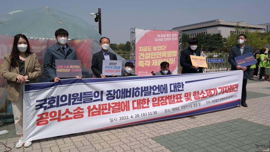 장애인의 날인 오늘(4월 20일), 국회의원 ‘장애인 비하 발언’에 대한 장애인 차별구제소송 1심 판결의 문제점을 지적하는 기자회견이 여의도 국회의사당 정문 앞에서 열렸다.