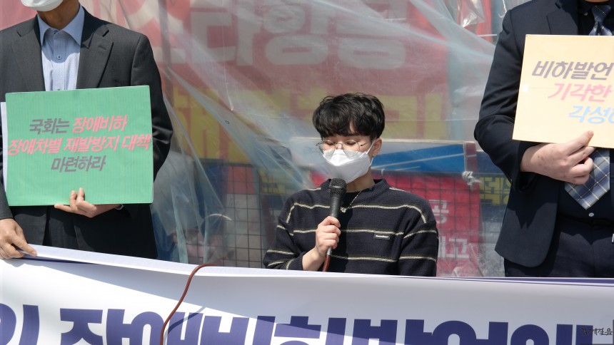 이날 연대 발언에 나선 시각장애 당사자 이동진 씨는 한 국회의원이 사용한 '외눈박이'라는 표현을 듣고 충격받았던 일화를 전했다. 그는 국민을 대표하는 국회의원들이 장애인을 비하하는 발언을 아무런 망설임 없이, 문제의식 없이 내뱉는 그 사실 자체에 충격과 아픔을 느꼈다고 한다. 이어 그는 "이 사회에는 다양한 사람들이 살고 있고, 다양한 국민이 살고 있다. 국회의원들이 그 사실을 간과하지 말고 재발 방지를 위한 대책을 세우기를 강력히 촉구한다"며 연대 발언을 마무리하였다.